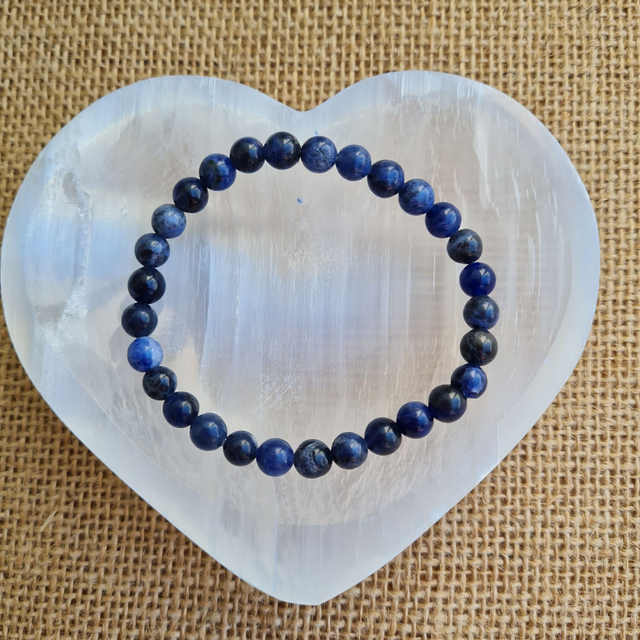 La Sodalite, aide à lutter contre l'hypertension, calmante, anti-stress, excellente pour les troubles de la gorge, améliore la circulation sanguine, fortifie la thyroïde, stimule le cerveau, confiance et stabilité.